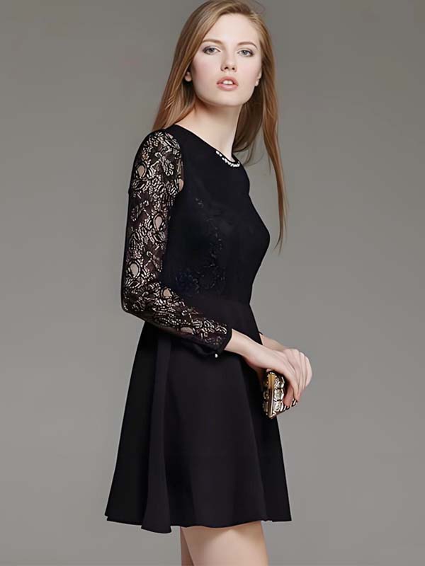 Black Lace-Sleeve Dress with Secure Lace Stitching & Hidden Seam Finishing