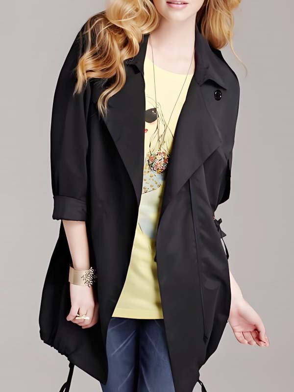 This black trench coat features a lightweight yet durable fabric, with a relaxed silhouette and rolled cuffs (finished with clean, even stitching). The single-button closure is attached with reinforced stitching, and the adjustable waist ties (sewn securely to the side seams) allow for a customized fit—all seams are aligned precisely for a polished, long-lasting look.