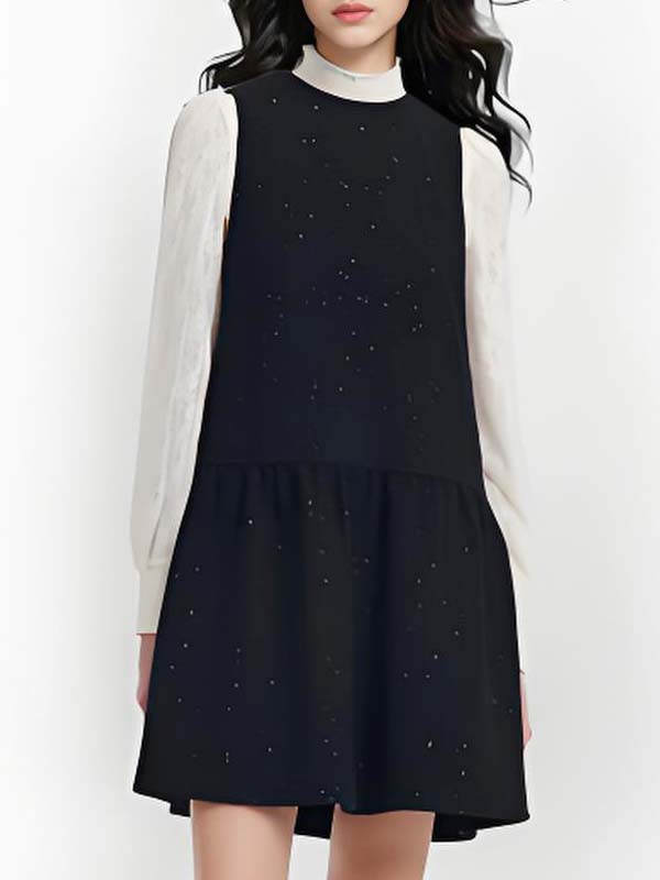 This black dress combines a sequined bodice with sheer long sleeves—sequins are securely stitched (to prevent detachment) and the sleeve fabric is attached with hidden seam finishing for a sleek look. The tiered skirt’s seams are aligned precisely, and the hem is finished with clean, consistent stitching.