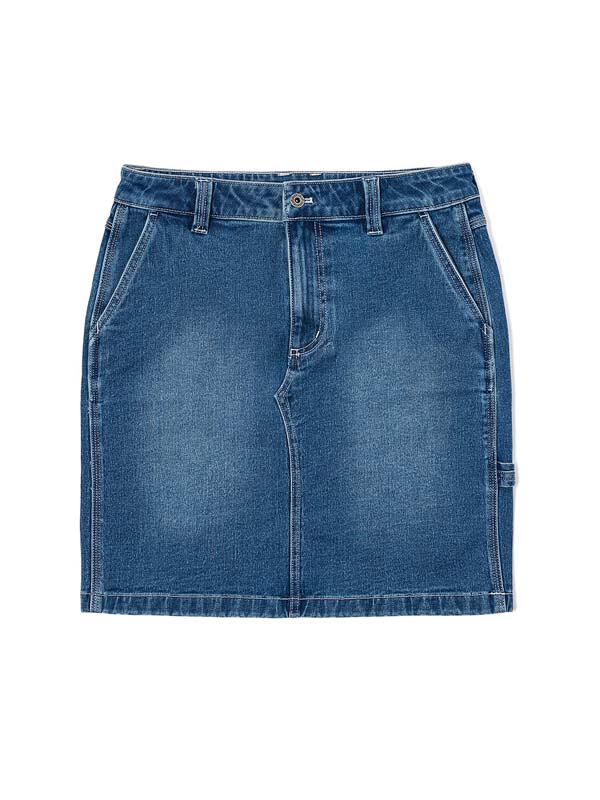 This dark blue denim mini skirt is constructed with evenly aligned double-stitched side seams (for symmetry and structure) and a reinforced waistband (double-threaded for stability). Pocket openings are reinforced with bar tacks to resist stretching, and the hem is finished with clean, consistent stitching.