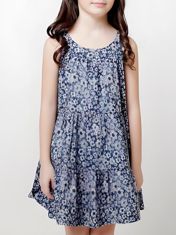 Girls’ Navy Blue Floral Sleeveless Dress: Lightweight Ruffled Sundress for Summer Casual Wear