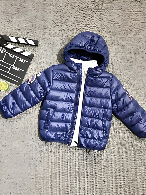 Design: Glossy navy quilted exterior, attached hood, full front zipper, and subtle patch details (adds a trendy, eye-catching touch).