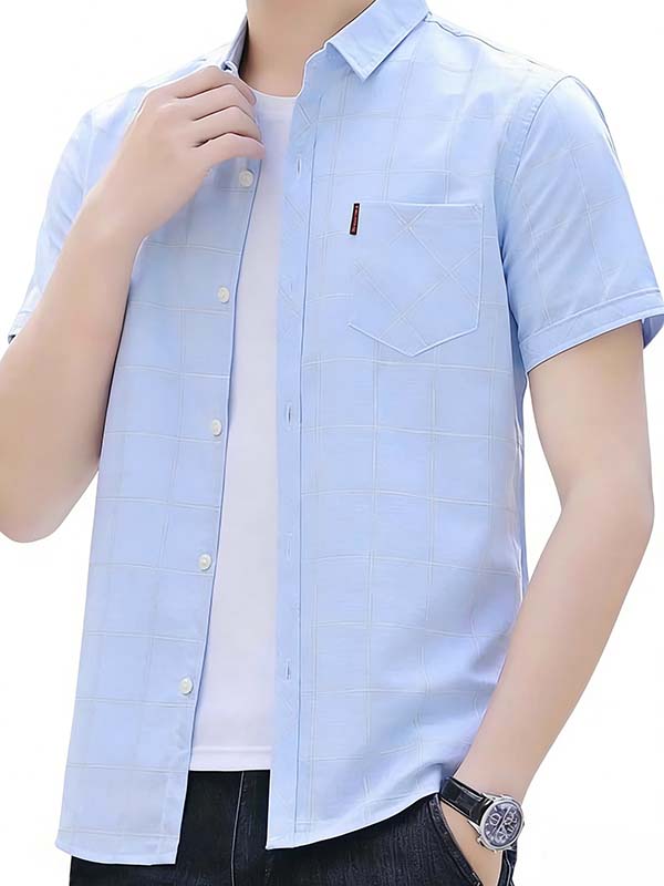 Men’s Light Blue Grid Short-Sleeve Shirt: Precision-Stitched Casual Button-Down Top