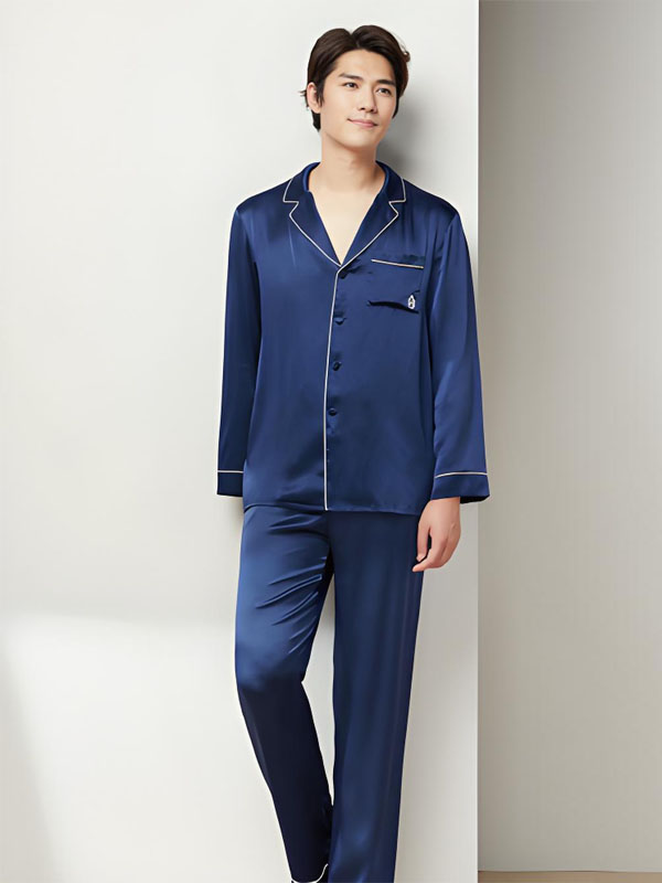 This satin pajama set is constructed with bound seams (finished with crisp white piping) that are securely stitched to prevent fraying. The long-sleeve top includes a stitched chest pocket (with reinforced edges) and button closures attached with reinforced thread for durability. Full-length pants feature aligned fabric panels and hems that are neatly bound and stitched. The glossy satin is cut with precision to avoid stretching or distortion during wear.