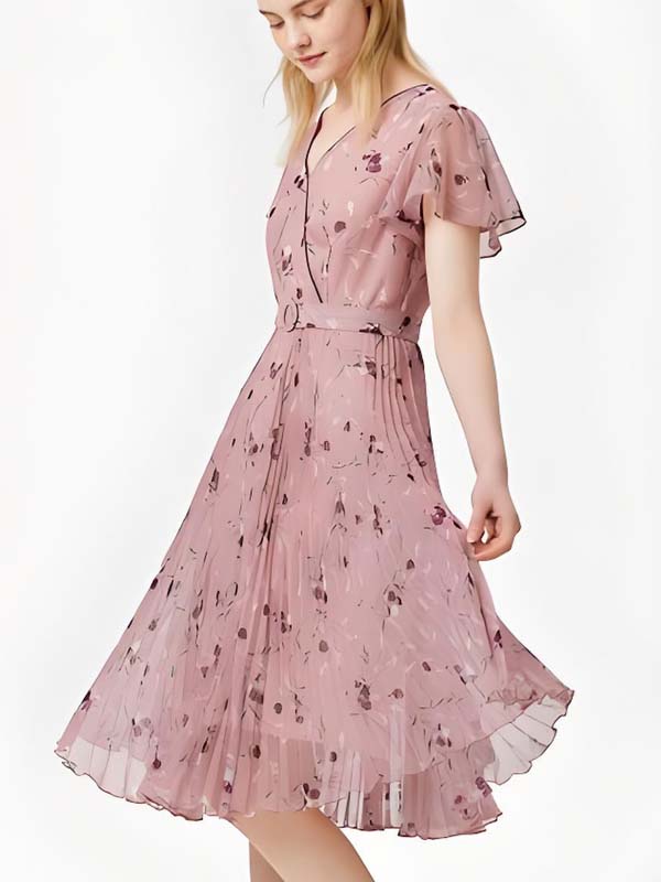 Pink Floral Pleated Dress with Precise Pattern Alignment & Secure Sleeve Stitching