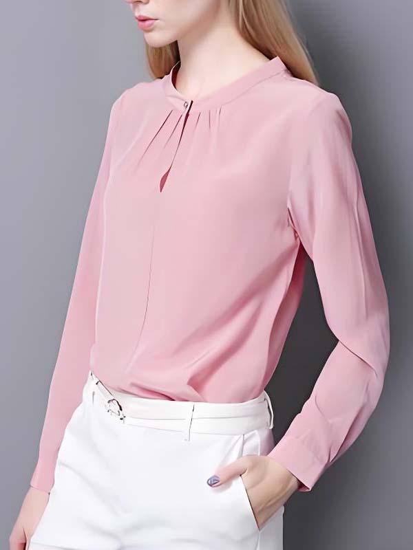 This pink blouse features a neatly stitched stand collar (aligned perfectly with the neckline) and long sleeves finished with clean, tailored cuffs. The front keyhole detail is reinforced with precise stitching to prevent stretching, and all seams are evenly pressed to ensure the smooth fabric maintains its structured, polished drape.