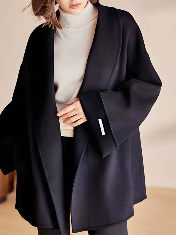 Women’s Oversized Black Coat – Lapel Collar, Hidden Closure, Cuff Detail